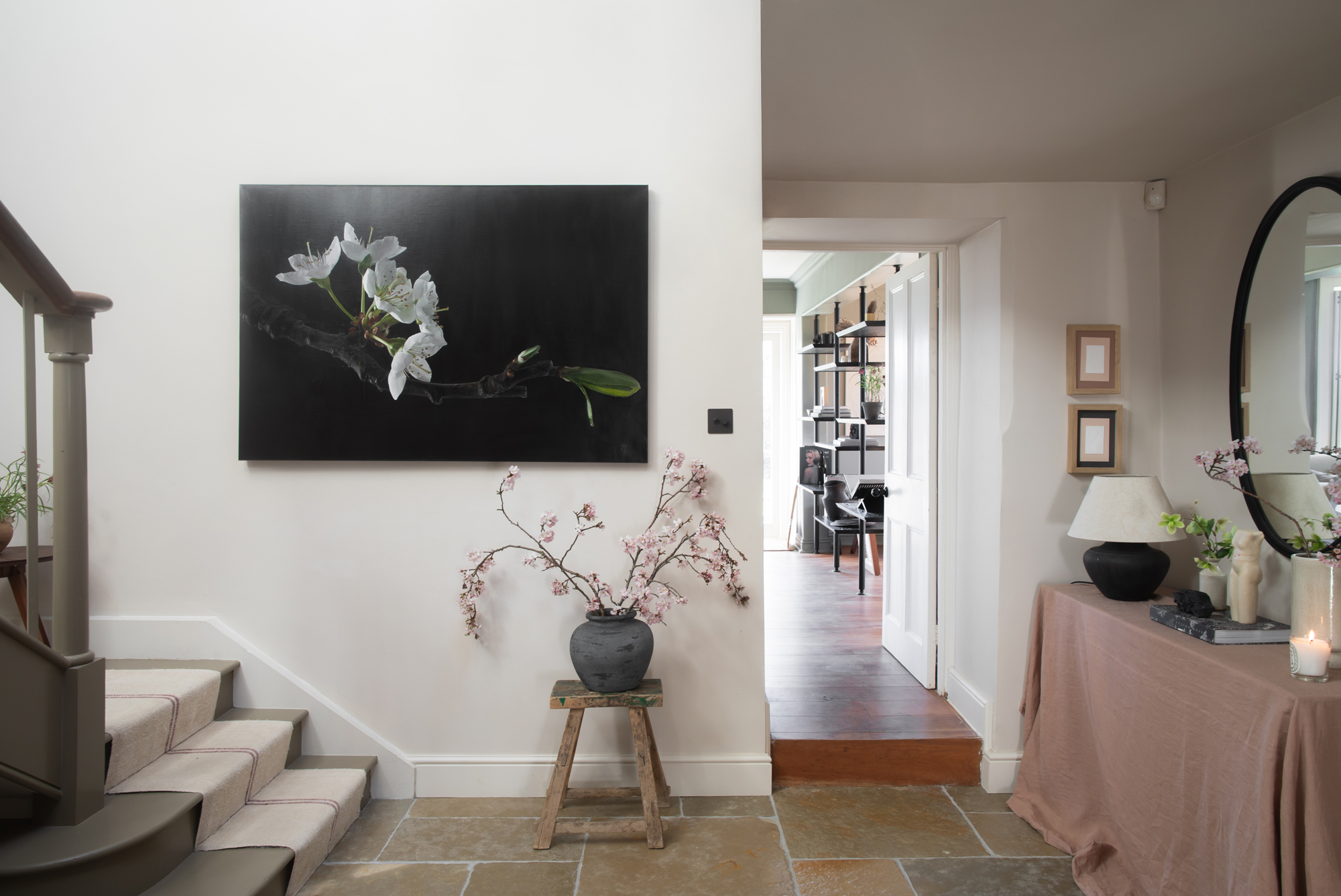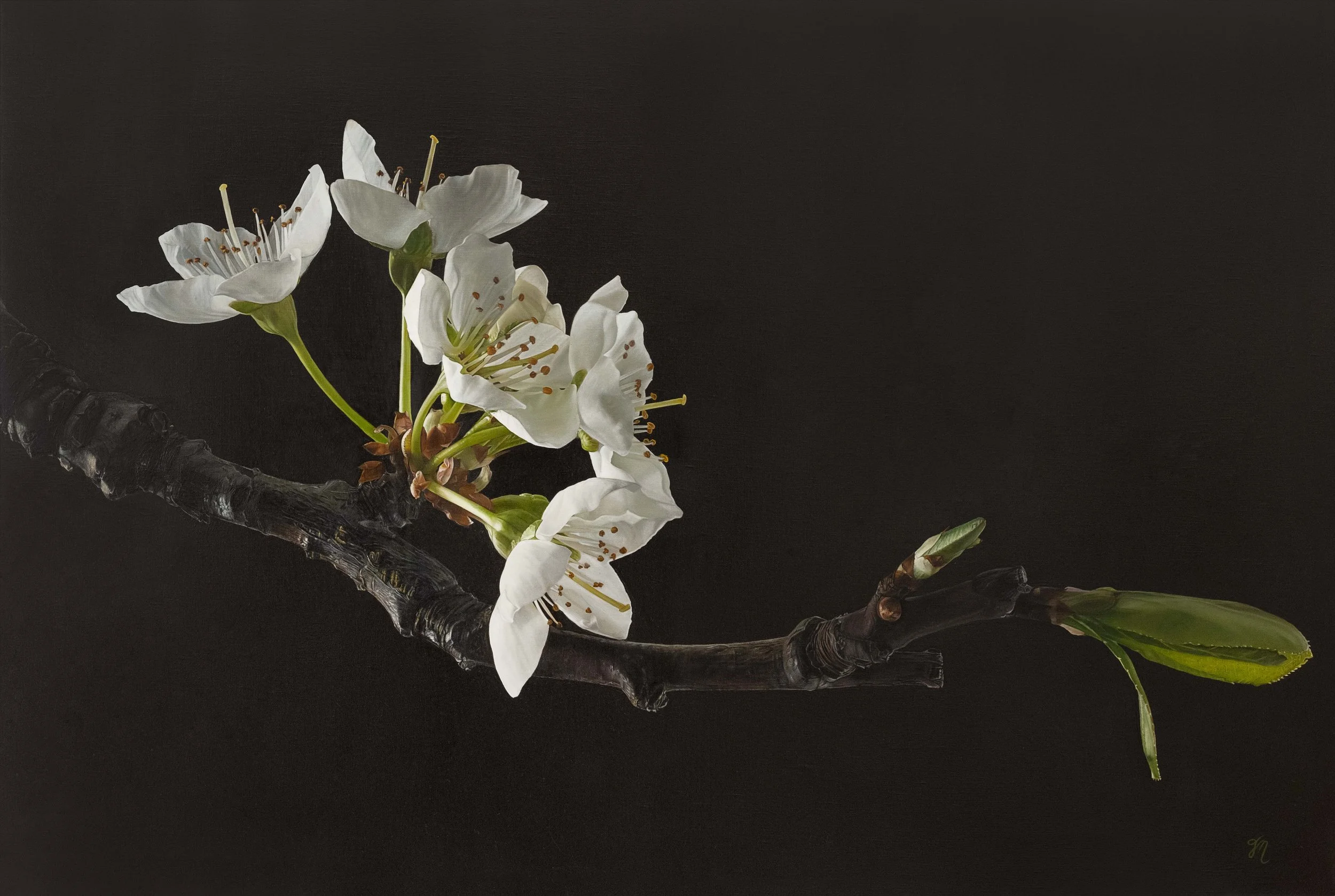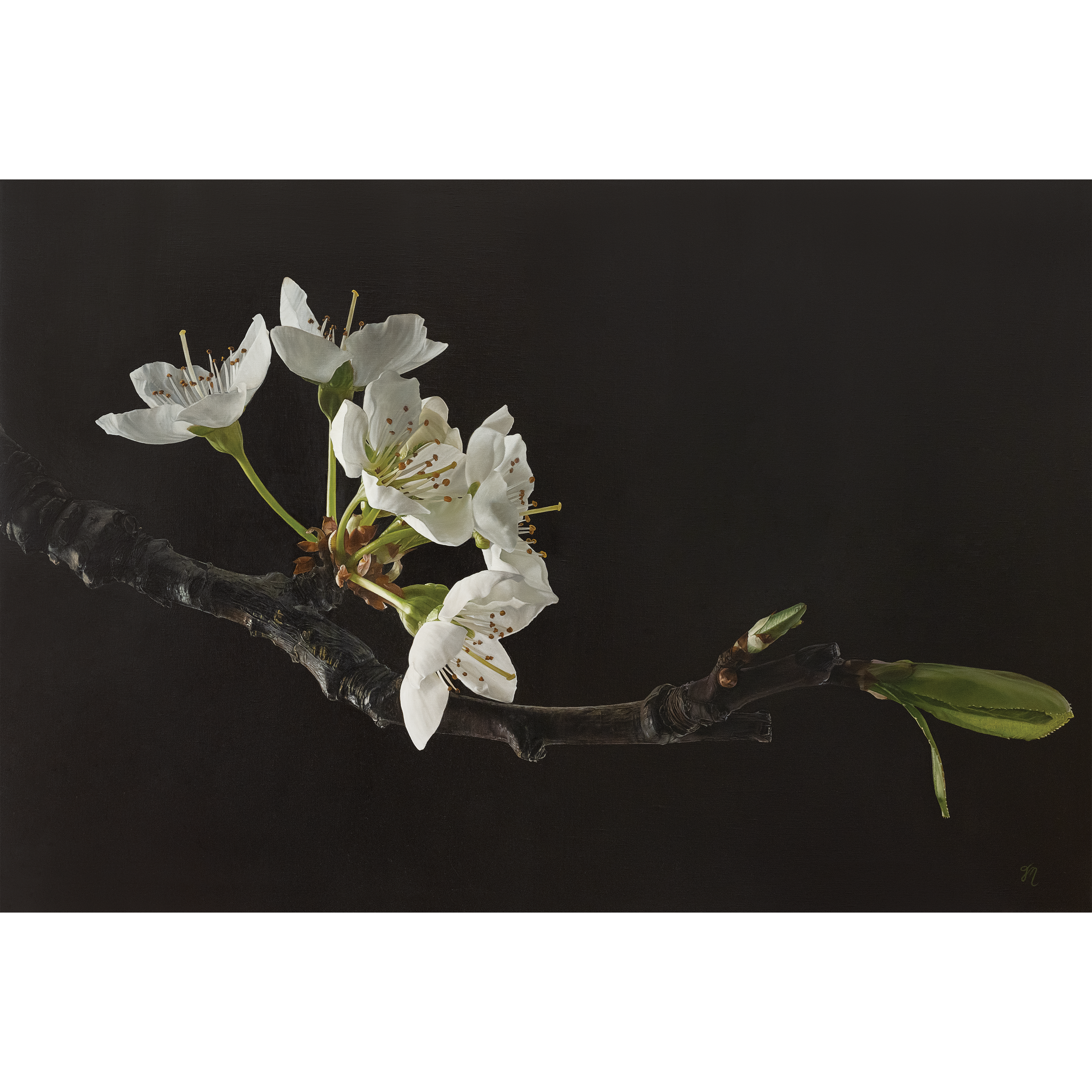 A branch of sakura enters from shadow, its blossoms resolved with deliberate clarity against a dark ground. The composition holds tension between fragility and force — the weight of the branch countered by the lightness of bloom.