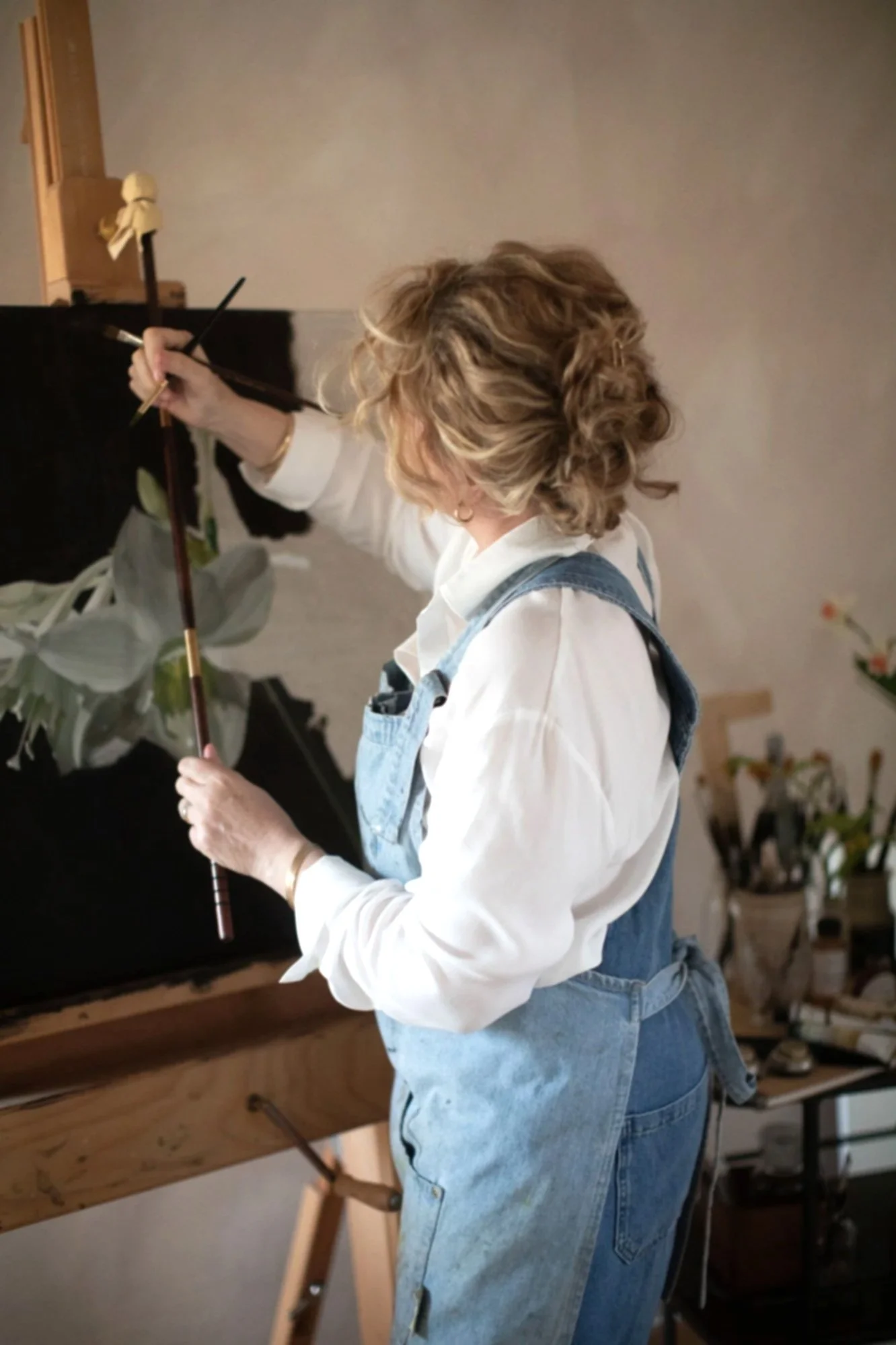 The composition balances fragility with structure. Layered glazes and restrained tonal shifts create a controlled radiance, allowing the blooms to hold space without excess.